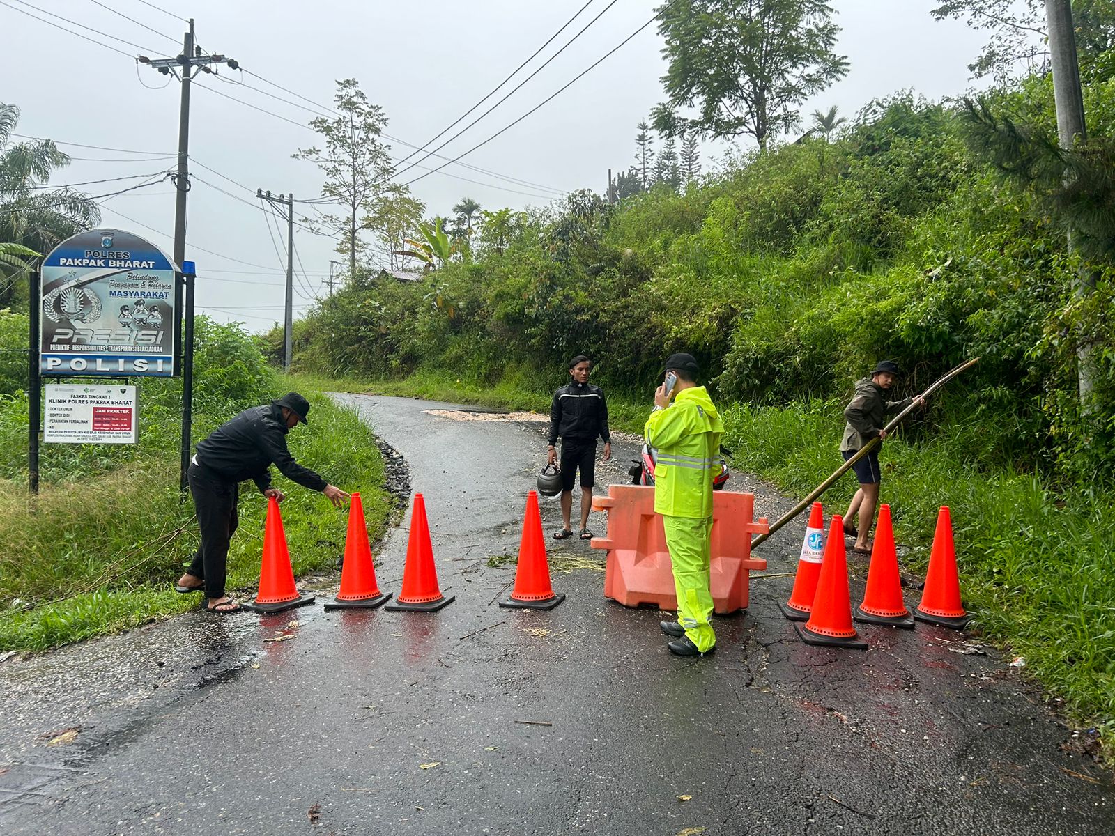Kapolres Pakpak Bharat AKBP Pebriandi Haloho S.H., S.I.K., M.Si melalui Wakapolres Kompol Donris E. Pasaribu S.H yang di wakili oleh Kasat Reskrim Iptu Pernandos T. Manik S.H selaku Tim III bersama personil melakukan Pengaturan arus lalin dan Pengamanan di titik lokasi Longsor jalan dari Desa Salak Kecamatan Salak menuju Desa Singgabur Kecamatan STTU Julu.