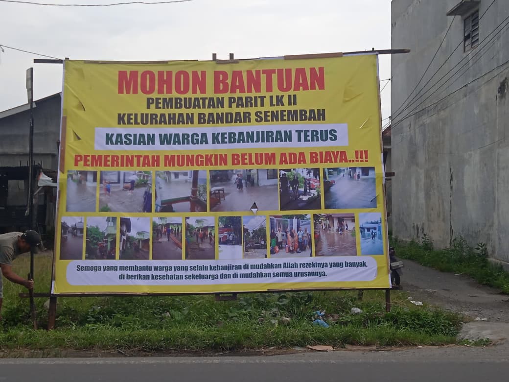 Sebuah baleho berwarna mencolok terpasang di Lingkungan II Kelurahan Bandar Senembah, Kecamatan Binjai Barat, Kota Binjai. Dalam baleho itu tertulis dengan tegas permohonan warga: “Mohon Bantuan Pembuatan Parit LK II Kelurahan Bandar Senembah – Kasian Warga Kebanjiran Terus.”