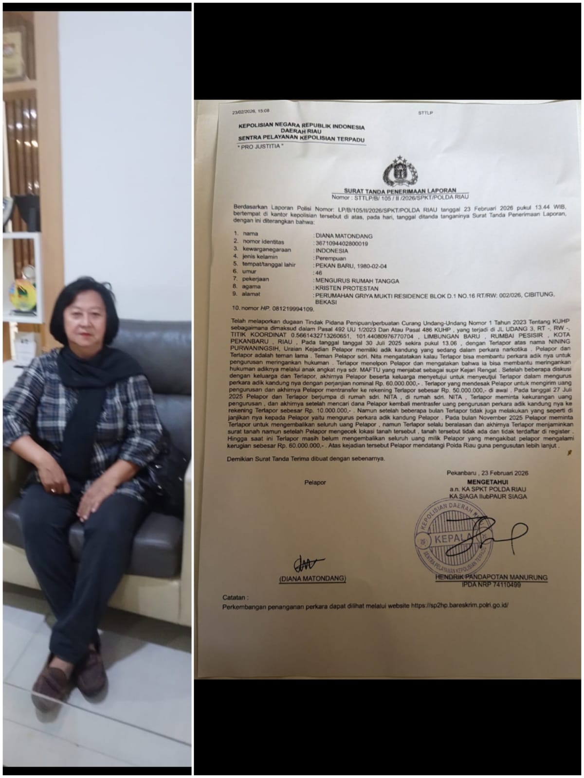 “Bulan Juli 2025, saya transfer ke rekening terlapor sebanya Rp50 juta. Saat itu saya masih di Jakarta. Lalu pulang ke Pekanbaru, saya transfer lagi dua kali pengiriman Rp5 juta dan Rp5 juta. Total semuanya Rp60 juta sudah kami kirim sama dia,” kata Diana.