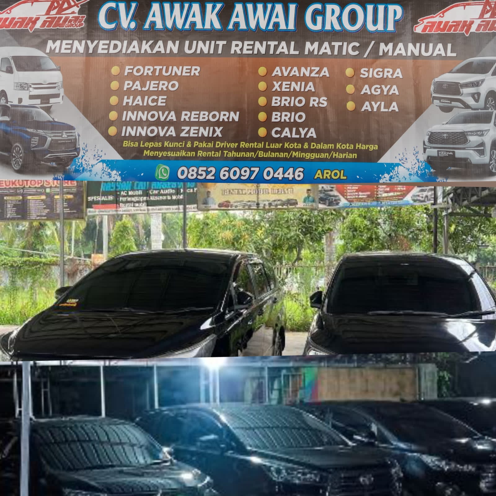 CV Awak Awai Grup menyediakan berbagai tipe mobil seperti Pajero Sport, Fortuner, Innova Reborn, Expander, Xenia, Brio, dan sejumlah pilihan lain yang dapat disesuaikan dengan kebutuhan. Semua kendaraan dijamin bersih, terawat, AC dingin, hingga irit BBM. Arol memastikan kenyamanan menjadi prioritas, baik untuk perjalanan keluarga, wisata, maupun keperluan dinas. Layanan lepas kunci juga tersedia untuk pelanggan yang ingin mengemudi sendiri, selain opsi menggunakan sopir berpengalaman.