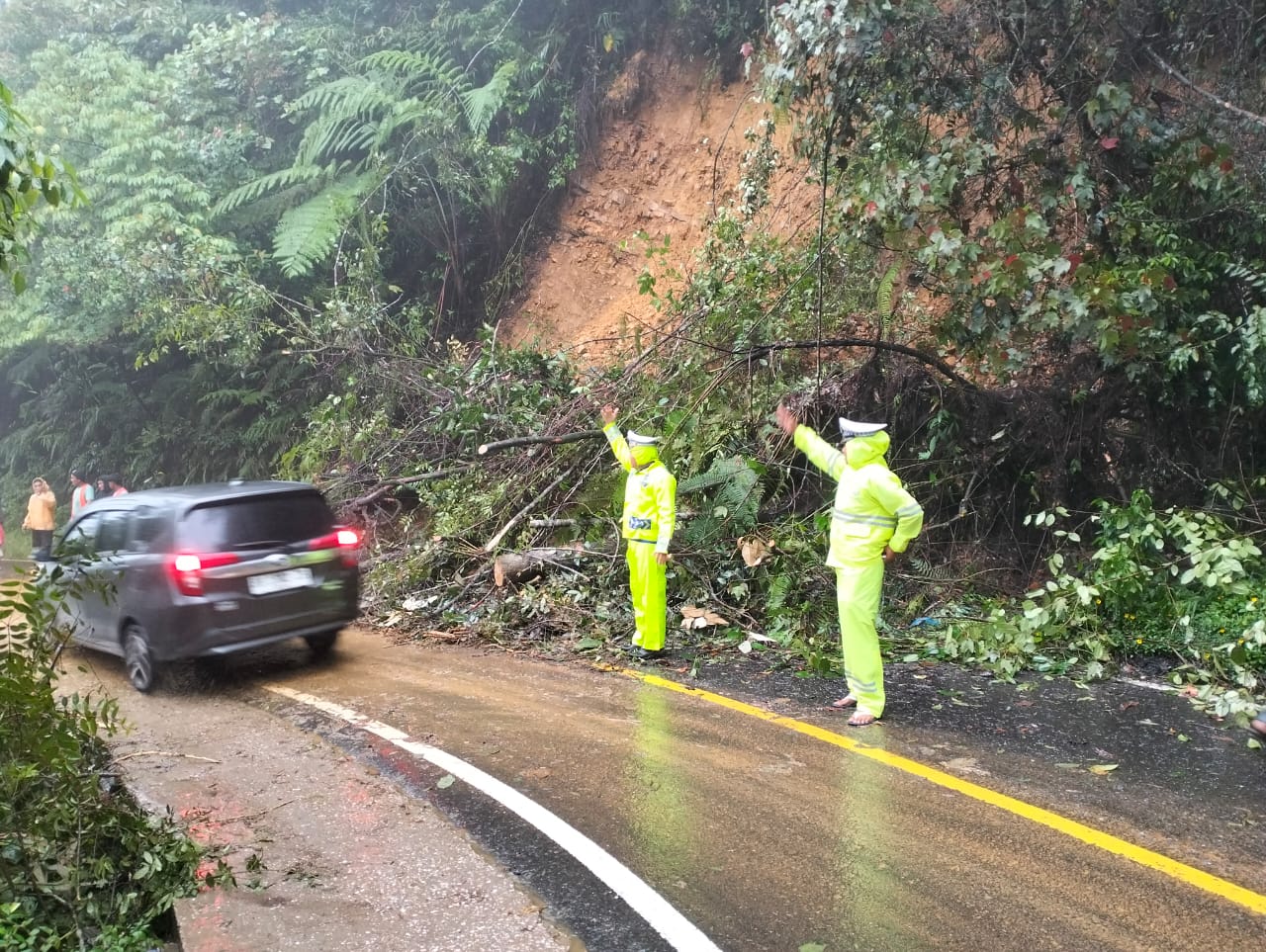 Selanjutnya Team bersama warga masyarakat sekitarnya melakukan Pembersihan terhadap batang pohon yang tumbang ke badan jalan menggunakan Chainsaw ( gergaji mesin ) dengan memotong bagian demi bagian dari pohon yang tumbang tersebutb untuk segera di singkirkan dari badan jalan berikut material pasir dan bebatuannya, Pembersihan areal TKP Longsor berjalan dengan baik dan aman, masyarakat pengguna jalan bisa lewat dengan lancar tanpa adanya hambatan.