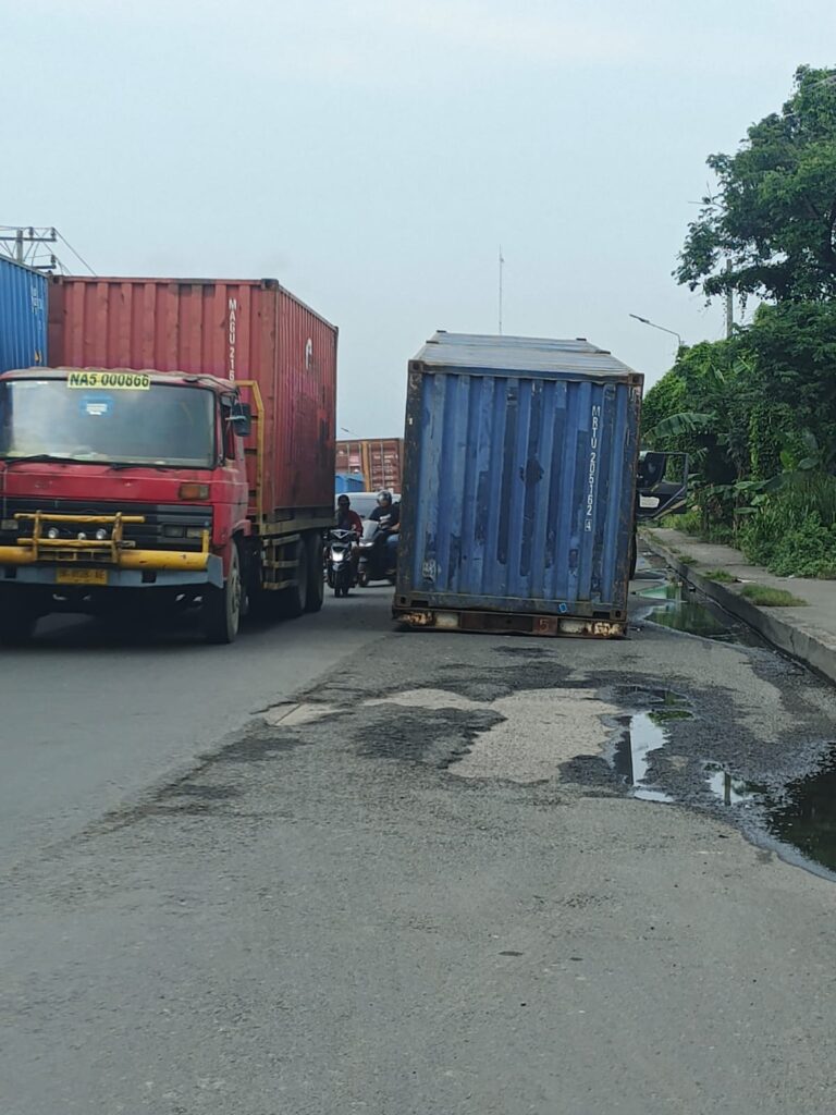 Dalam foto yang beredar, terlihat kontainer berada di tengah badan jalan dengan posisi tidak normal, sementara sejumlah truk lain dan pengendara sepeda motor terpaksa melintas secara bergantian dengan ruang jalan yang sempit. Kondisi jalan yang berlubang dan tergenang air di sekitar lokasi turut memperparah situasi.