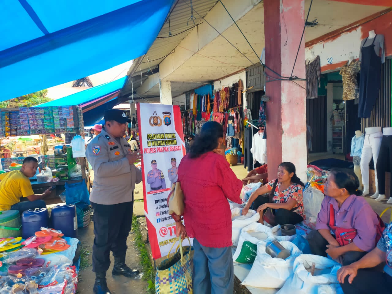 Kegiatan berkeliling di Pasar Rakyat Onan Klohi yang di lakukan oleh Satuan Pembinaan Masyarakat Polres Pakpak Bharat untuk mengajak masyarakat menjaga Kamtibmas di wilayahnya masing-masing berjalan dengan aman baik dan lancar, baik masyarakat yang berbelanja dan para pedagang senang melihat kehadiran pak Polisi di tengah aktivitas mereka.