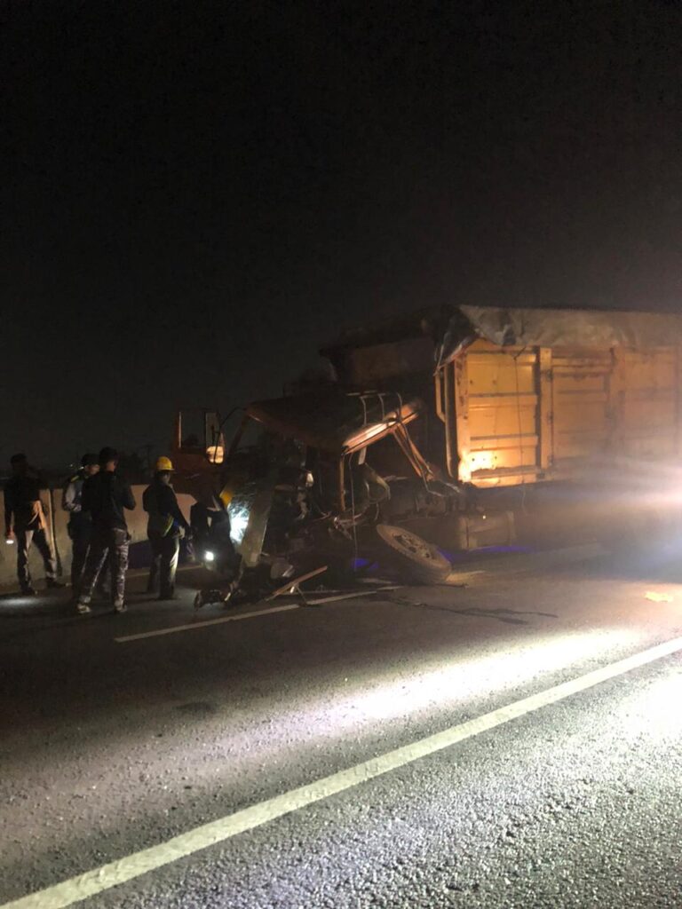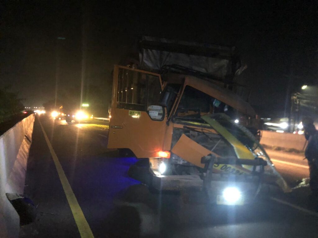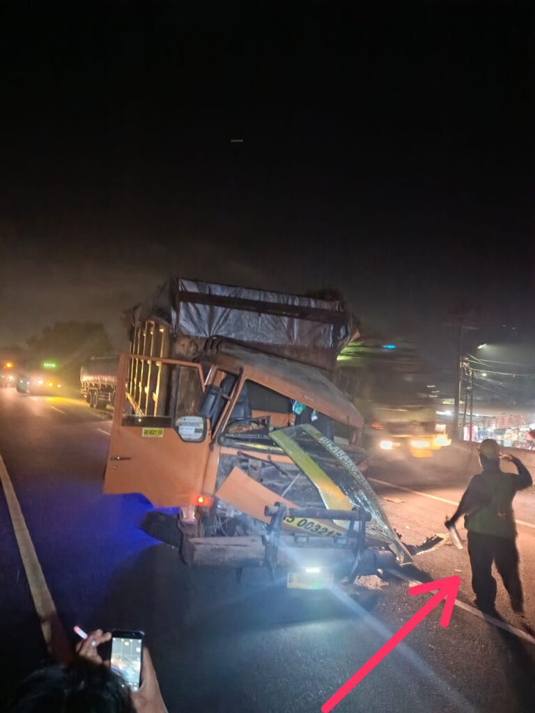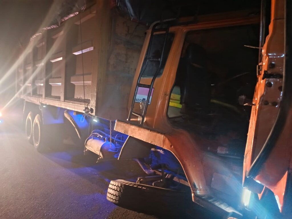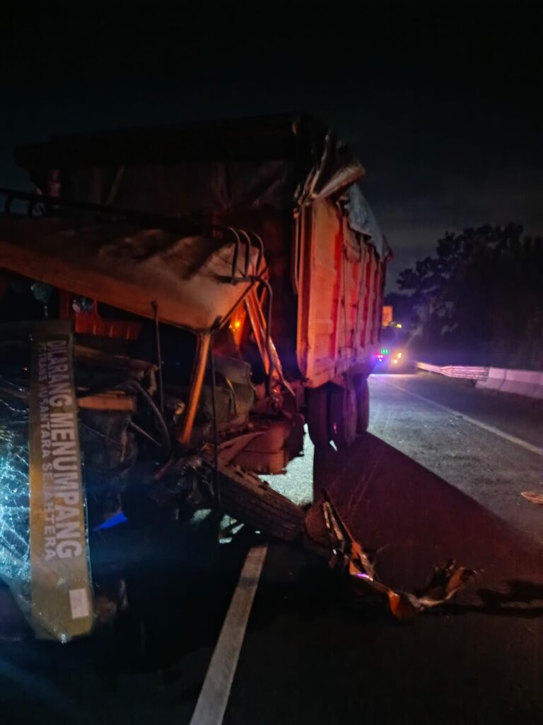 MITRAPOLDA.COM – MEDAN – Kecelakaan lalu lintas yang melibatkan kendaraan angkutan berat kembali terjadi di ruas Tol Belmera, tepatnya diatas Terowongan Tol Kelurahan Sei Mati-Medan Labuhan, tidak jauh dari pintu Tol Belawan, pada Sabtu malam (24/1/2026). Peristiwa yang terjadi sekitar pukul 22.40 WIB ini melibatkan dump truck yang bermuatan (Pakan Ternak) yang menghantam bagian belakang truk kontainer yang sedang berhenti di jalur tersebut.