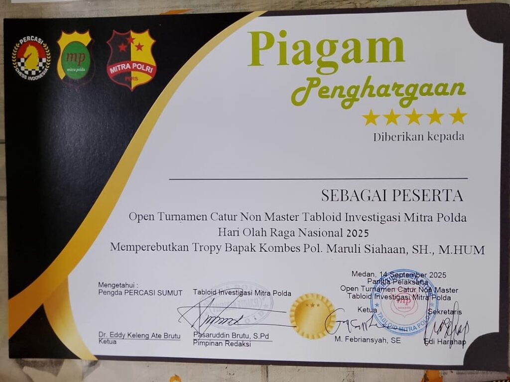 Dalam rangka memperingati Hari Olahraga Nasional, Tabloid Mitra Polda sukses menyelenggarakan Open Turnamen Catur Non Master di Café Rumah Kupi Atjeh, Jalan Menteng Raya, Medan, Minggu (14/9/2025). Turnamen ini menjadi salah satu ajang bergengsi yang mempertemukan para pecatur amatir dari berbagai daerah, sekaligus memperkuat semangat persaudaraan dan sportivitas di tengah masyarakat.