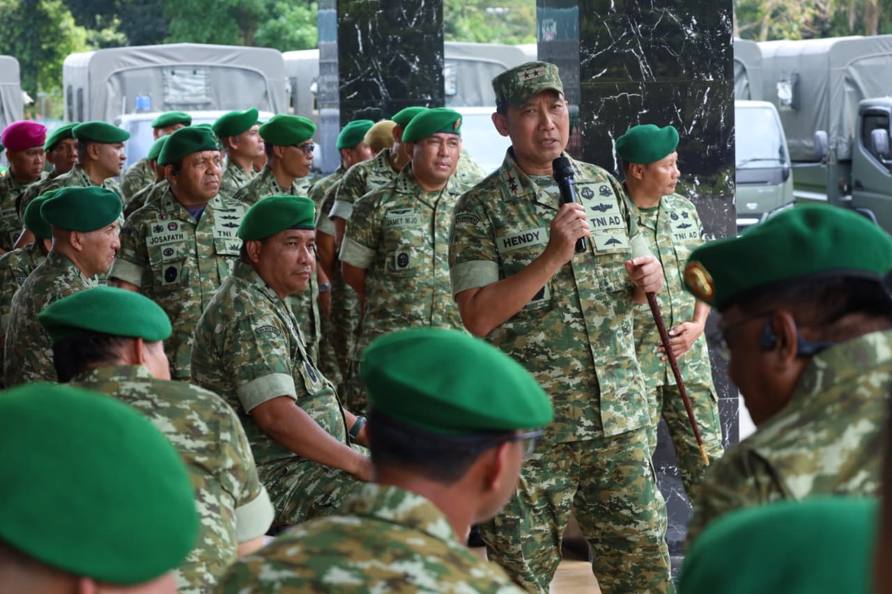 Pangdam I/Bukit Barisan Mayjen TNI Hendy Antariksa menyerahkan secara simbolis 41 kendaraan dinas berupa 11 unit ransus Jeep Maung Jelajah dan 30 unit truk 2,5 ton Mitsubishi Canter 4×2 di Makodam I/BB, Medan, Selasa (3/3/2026). Penyerahan tersebut merupakan bagian dari percepatan pendistribusian randis dukungan dari Kemhan RI guna menunjang tugas operasional satuan jajaran Kodam I/BB.