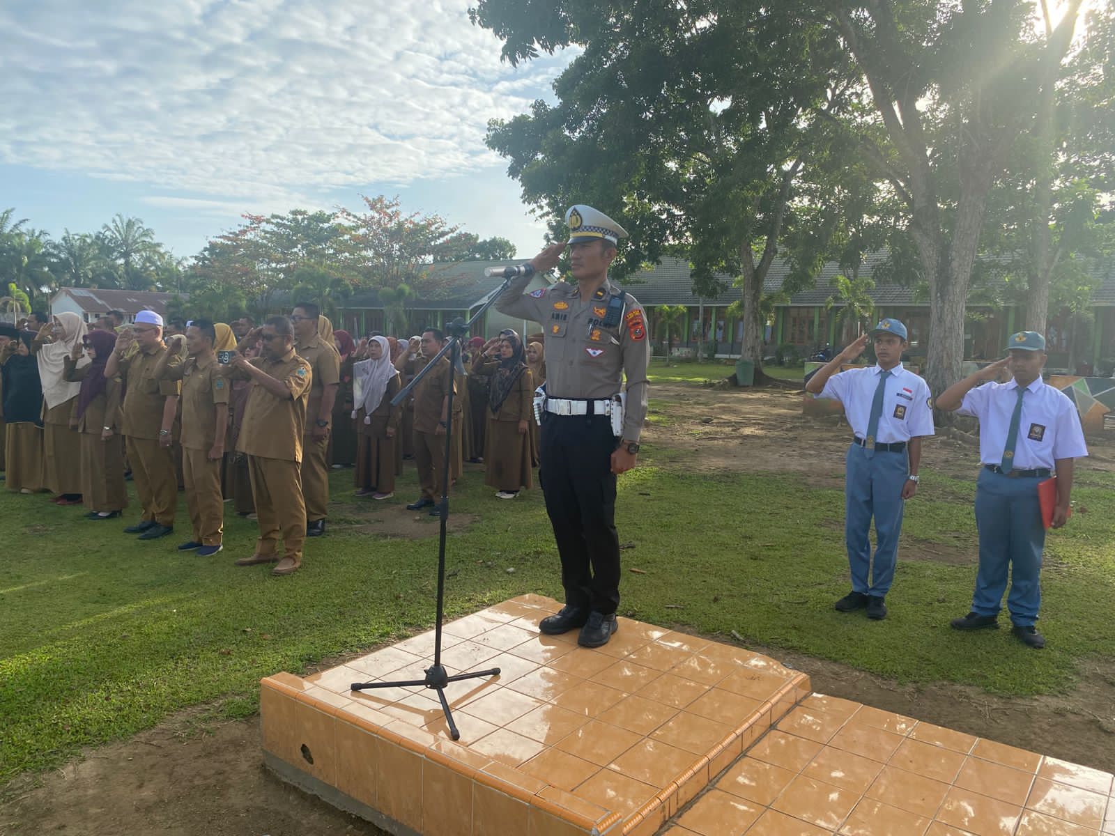 Laksanakan arahan Kapolres Padang Lawas AKBP Dodik Yuliyanto S.I.K., Satlantas Polres Padang Lawas berikan amanat kepada siswa/i bahas edukasi tertib berlalulintas dan lainnya dalam Rangka HUT Satlantas Ke-70 Tahun 2025. Program Police Gooes To School saat isi apel upacara di SMKN 1 Barumun, Kabupaten Padang Lawas. Senin (08/09/2025) pagi.