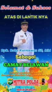 MITRAPOLDA.COM, Belawan – Keluarga besar Mitra Polda menyampaikan ucapan selamat dan sukses atas pelantikan Bapak Roby Kurniawan, SE, MM, sebagai Camat Belawan. Ucapan apresiasi ini kami sampaikan sebagai bentuk dukungan terhadap kepemimpinan baru di wilayah Kecamatan Medan Belawan.